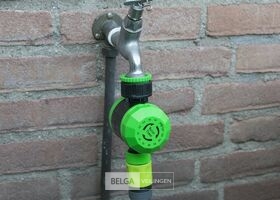 Tuinslang Watertimer Kinzo., Deze watertimer is makkelijk tussen de kraan en de tuinslang te plaatsen en is instelbaar tussen de 5 en 120 minuten., Na het verstrijken van de tijd stopt de watertimer de watertoevoer automatisch., Deze waterklok is ideaal bij het vol laten lopen van vijver of zwembad en voor het sproeien van de tuin., Afmeting waterklok: ca. 13,5x8x6 cm.