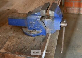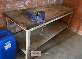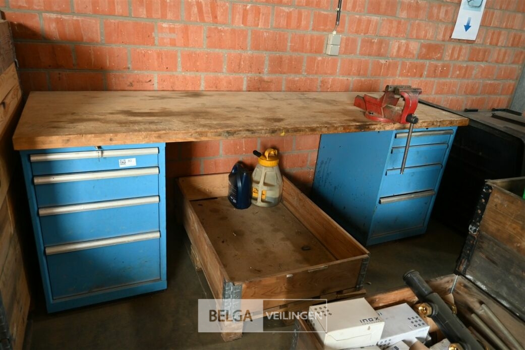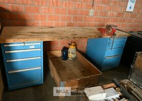 Houten werkbank met bankvijs afm 250 x 80 x 96 cm, houten tablet 5 cm, 2 x Blauwe Kast met 4 lades 57 x 73 cm