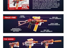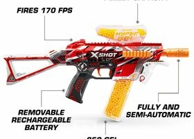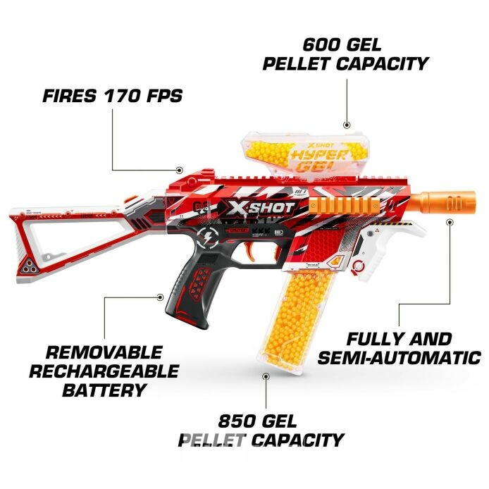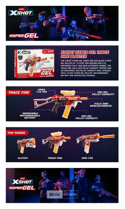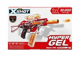 De X-Shot Hyper Gel Trace Fire blaster kan Hyper Gel Pellets afvuren met een snelheid van 51 meter per seconde met zijn gemotoriseerde vol- en halfautomatische standen.kompleet in doos-Gelpellets kunnen bij Dreamland aangekocht worden
